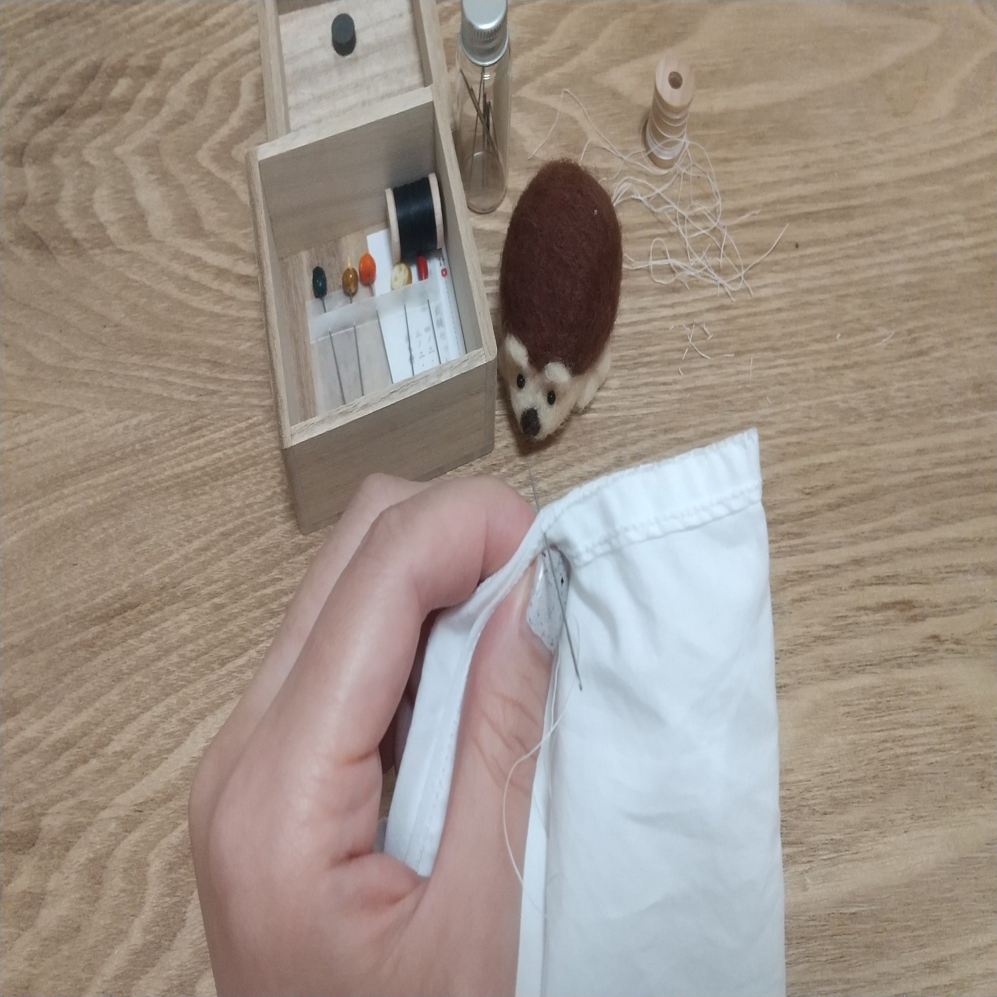 このままだと荷物が入れられないので、裾と脇を縫っていきます。