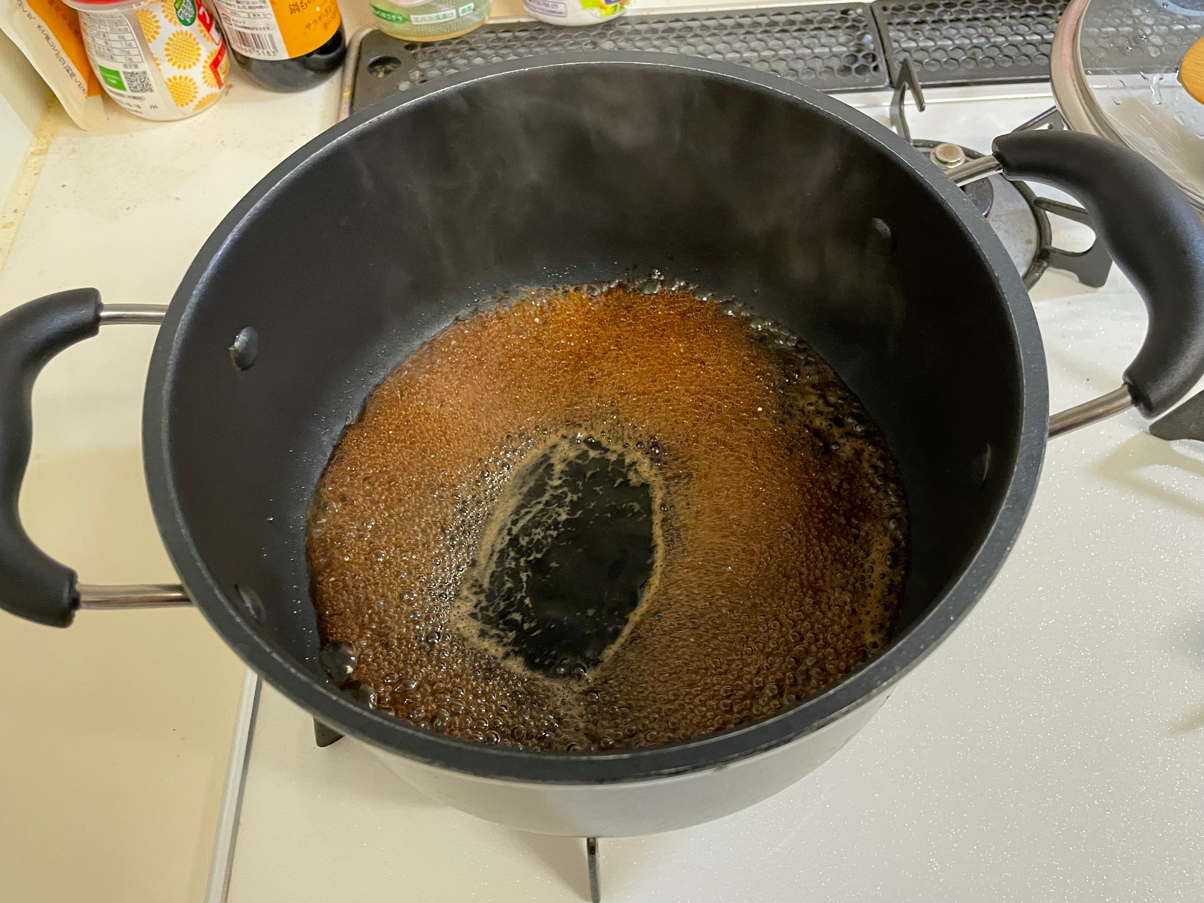 半分くらいの量になるまで煮詰めるらしいです。正直、この量から半分くらいの量ってわかりずらいな…!