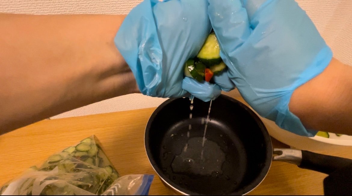 次の工程ではキュウリを絞った後にそのまま鍋に入れるとのことですが1つずつやりたい人や要領がわからない人は1つずつやってもいいかもしれません。