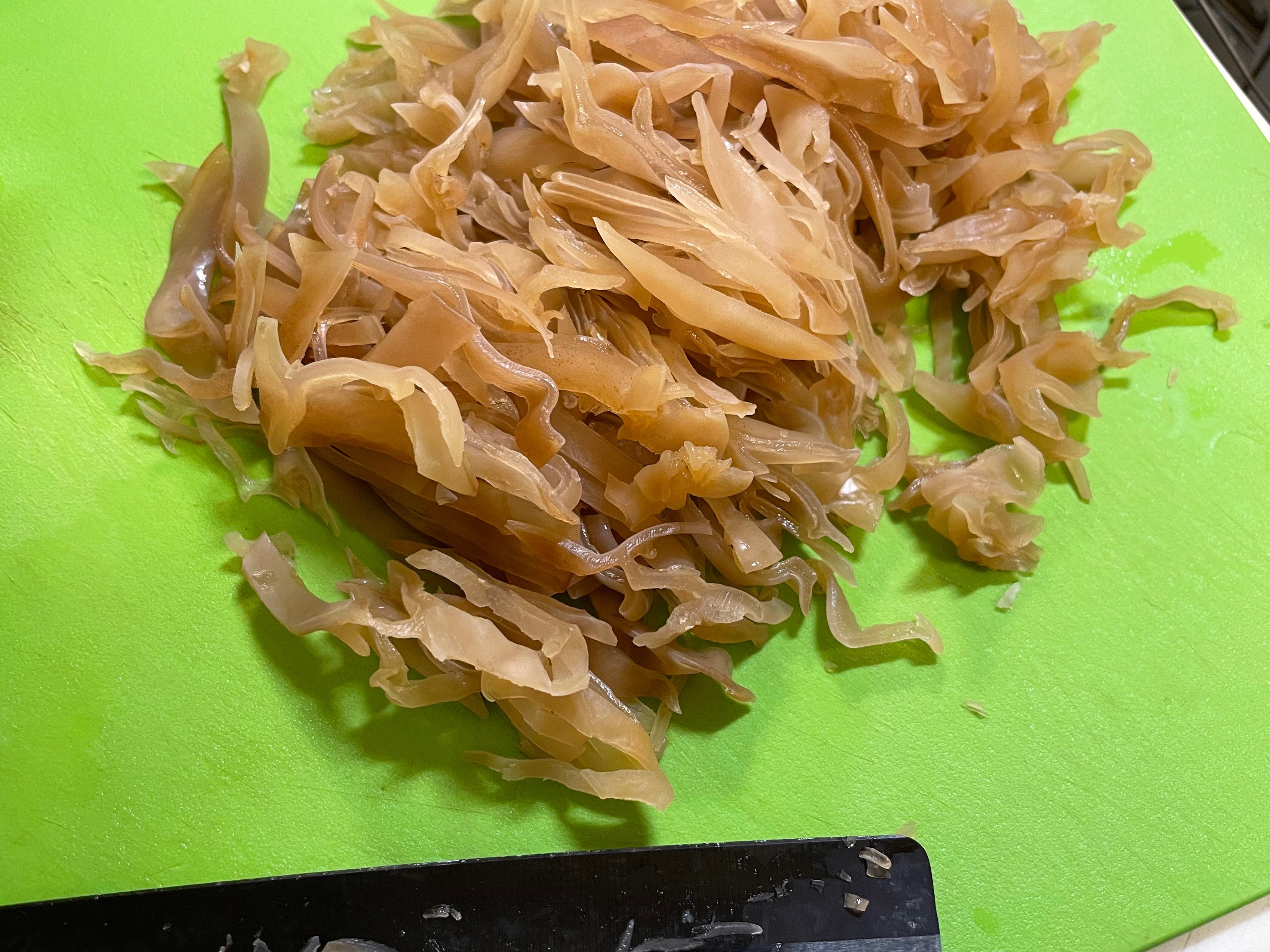 この水に浸して大きくなったキクラゲを千切りにしていきます。