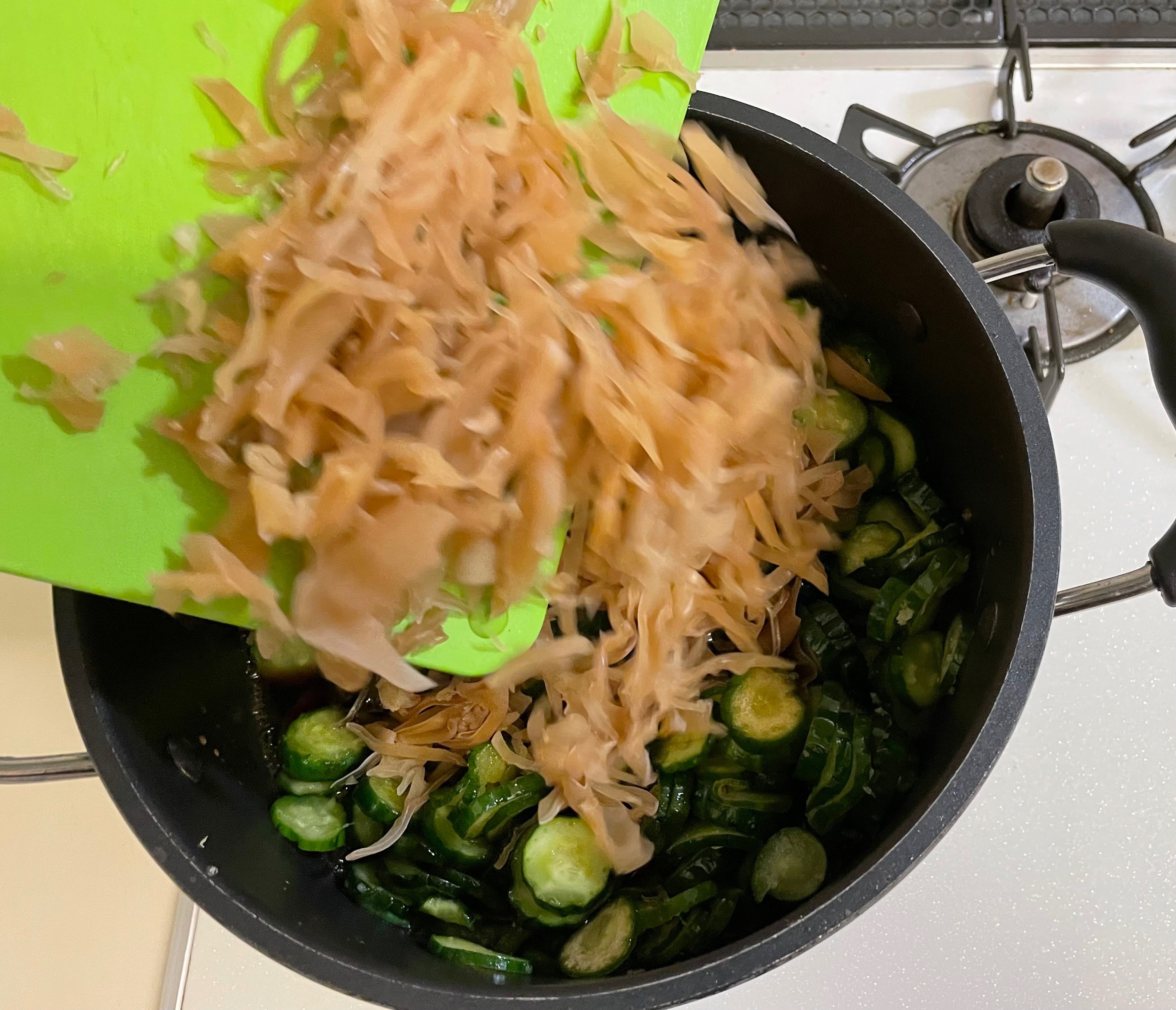 そんで煮詰めている鍋に絞ったキュウリを投入していきます。