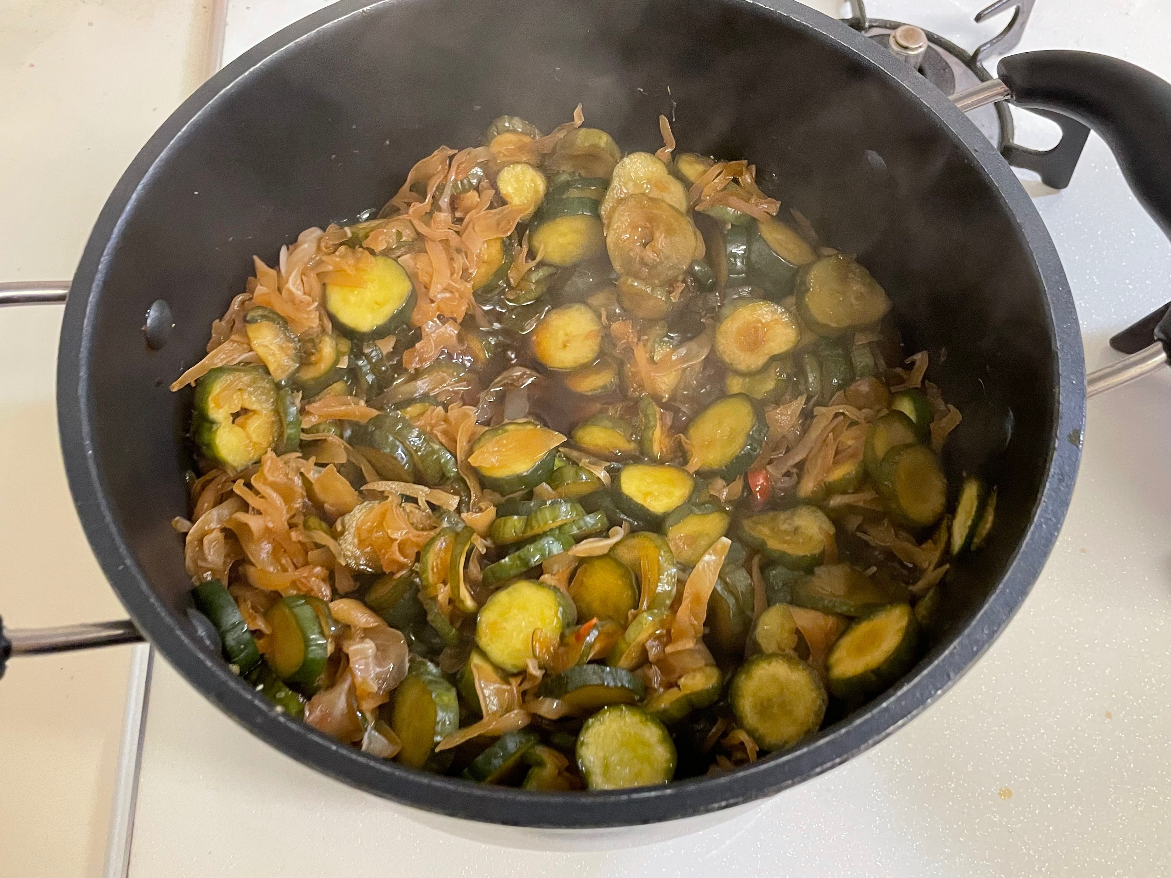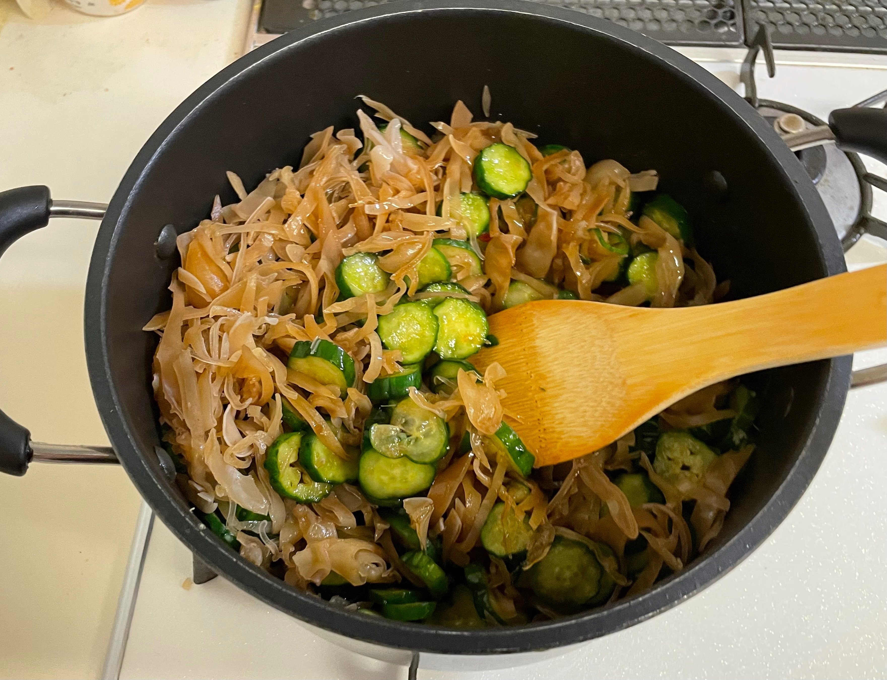 工程の順番はこの並びですが煮詰める中に次のキュウリを絞る作業をしてもいいしキクラゲを千切りする作業をしてもいいし、作業中に鍋が煮詰めたら火を止めても良い。